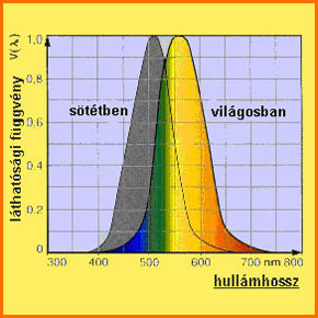 | A fény Az emberi szem az elektromágneses sugárzás 380-780 nm közötti hullámhosszúságú tartományát érzékeli látható fényként. Látószervünk azonban nem egyformán érzékeny a különböző hullámhosszú sugárzásokra, ezért eltérő érzékenységi görbe vonatkozik a világosban és a sötétben való látásra. A világítástechnika rendszerint a világos érzékenységi görbét veszi alapul, melyet V(lambda) jelöléssel illet - a sötét érzékenységi görbe jelölése a V'(lambda). |