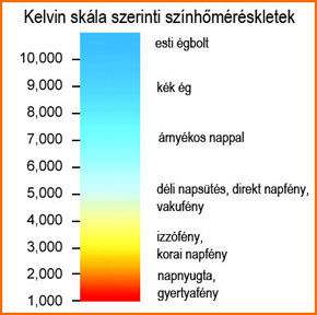 | Színhőmérséklet A fényforrások által sugárzott fény erőssége mellett annak színe is meghatározó. A mesterséges fényforrások színhőmérséklete 3300K és 5300K között tekinthető semlegesnek, a 3300K-tól kisebb színhőmérséklet melegfényűnek, míg az 5300K felettiek hidegfényűnek számítanak. Példa: a normál izzólámpa izzószála 2800K, az északi égbolt fénye 6000K-tól magasabb. |
