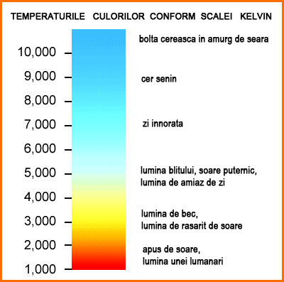 De exemplu:arcul electric dintu-un bec normal este de 2800K,în timp ce bolta cerească pe timp de noapte este de peste 6000K. |